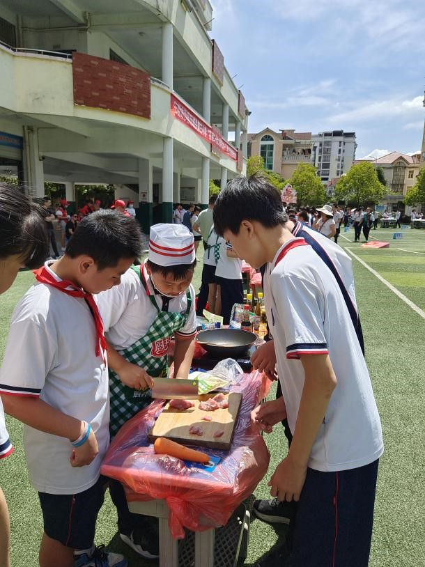 本次活动共分为厨艺、洗晾、清扫、种植、创意五个项目环节开展,一到六年级的小朋友们各自分工,从煮沙县拌面到洗衣服,从卫生区清扫大比拼到“一米菜园”种植比拼,再到最后的缤纷水果拼盘,场面无比热闹。