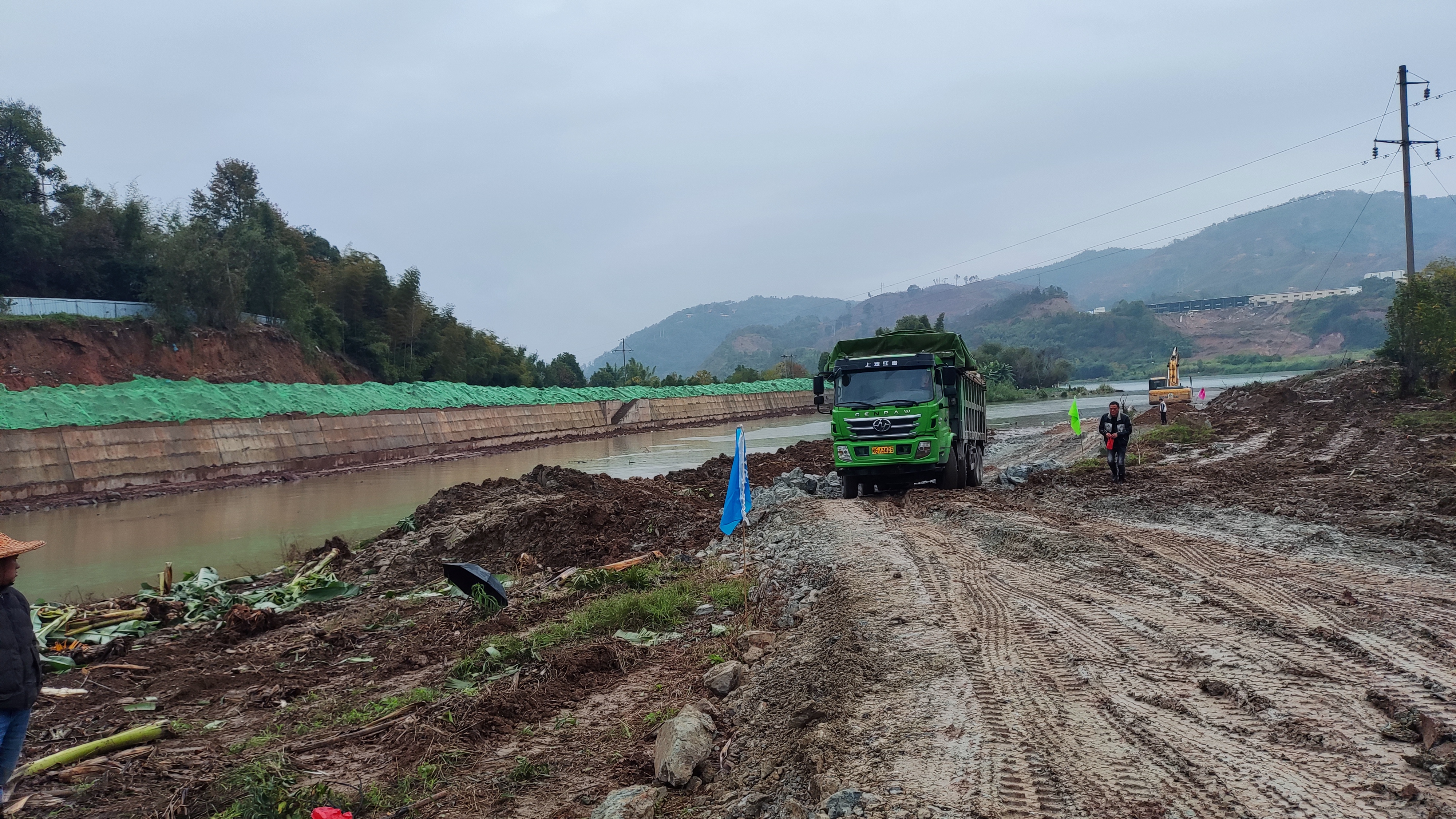 3. 右岸溪口老桥至沙溪河汇合口堤段土方开挖,基础以下块石换填及抛石挤密,长度72米。