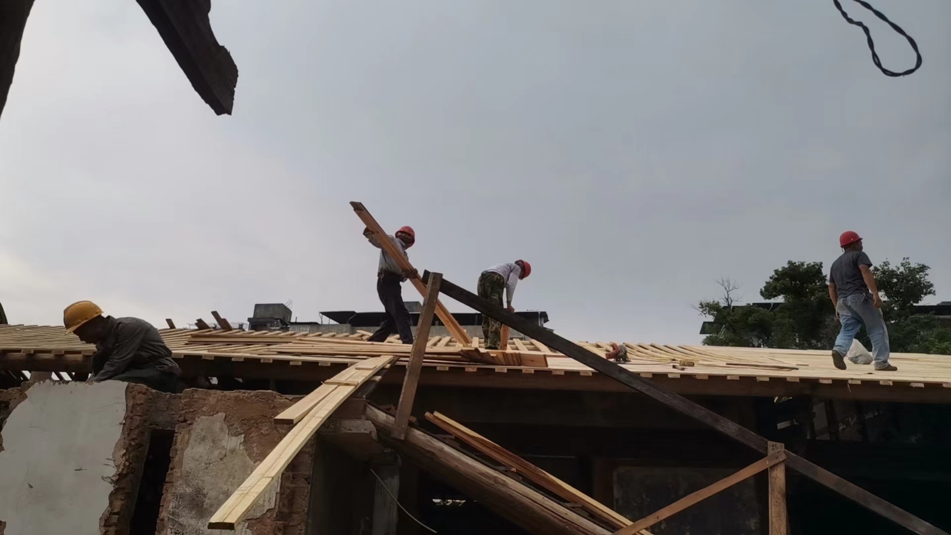 完成院内南面倾斜老墙拨正,第二进柱、梁及木望板更换。完成北面迎街老墙倾斜部分空斗墙拆除。