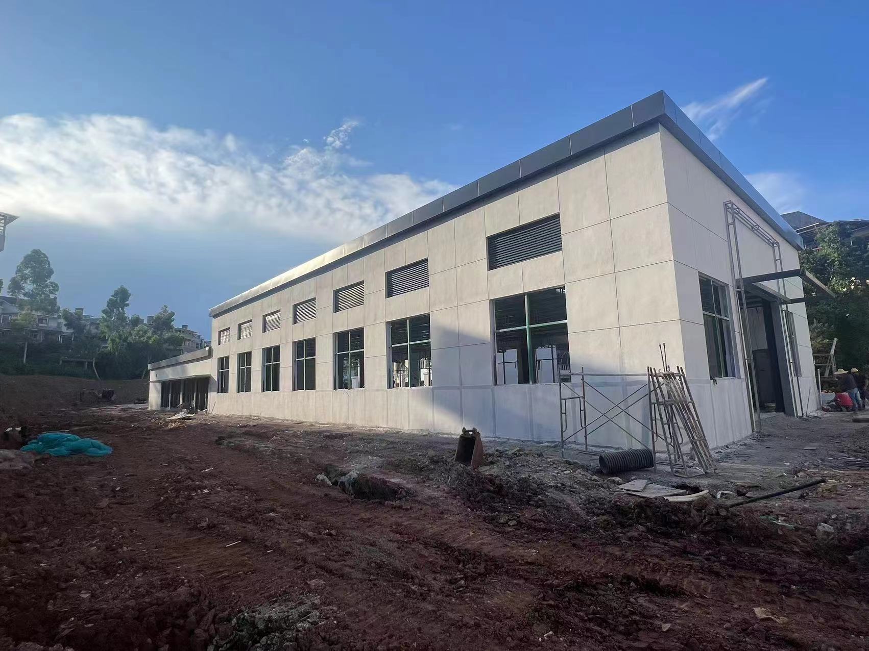 进行室内地面瓷砖铺贴,外墙脚手架拆除。室外围墙喷漆完成30%,室外景观铺贴完成20%。