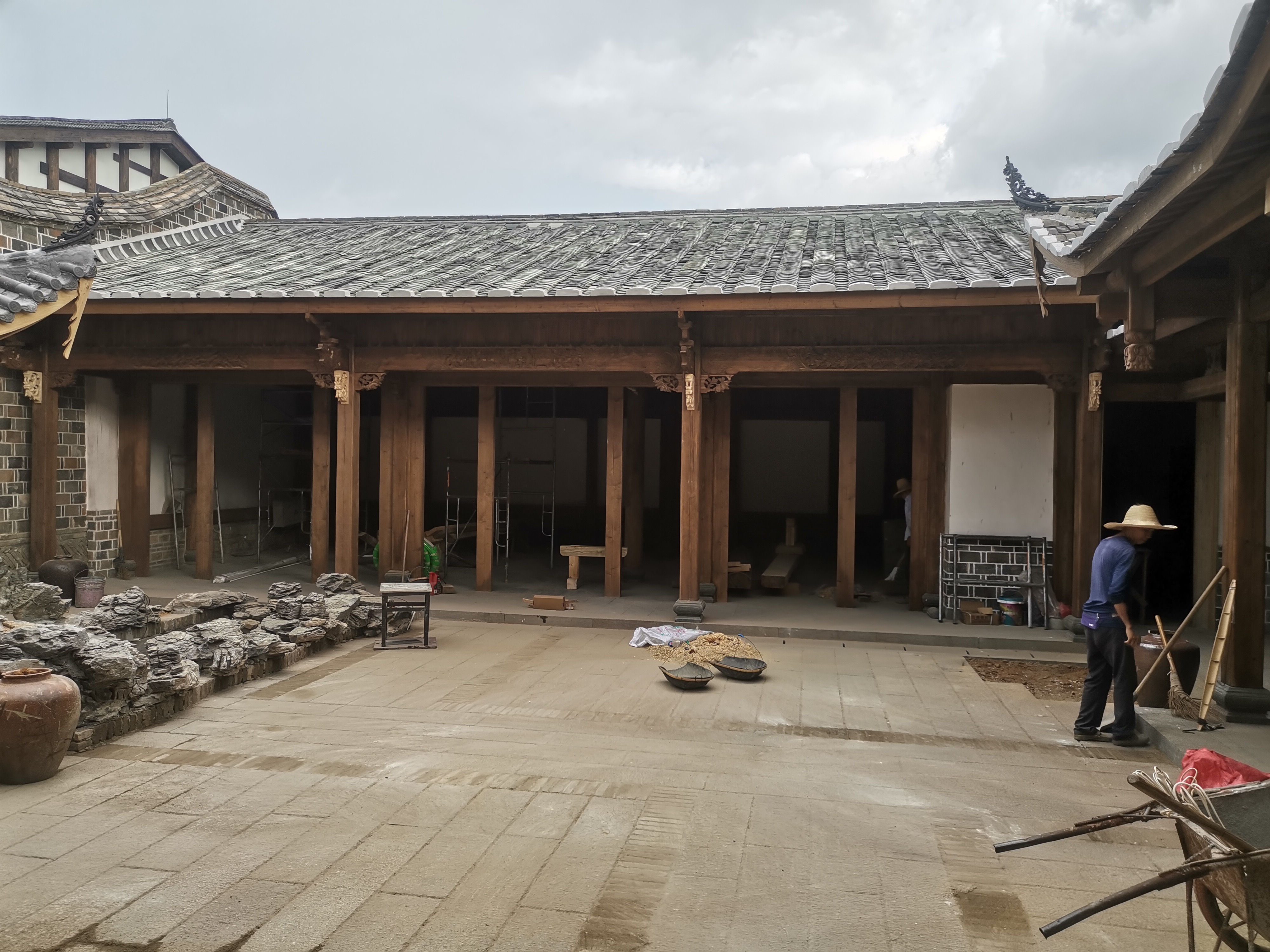 进行A1楼门窗安装,室外木构做旧施工。完成A2楼收尾工作。