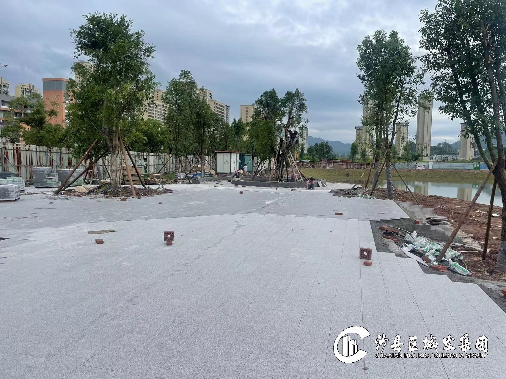 完成树池广场PC砖铺贴500平方米,绿化地被施工1500平方米。