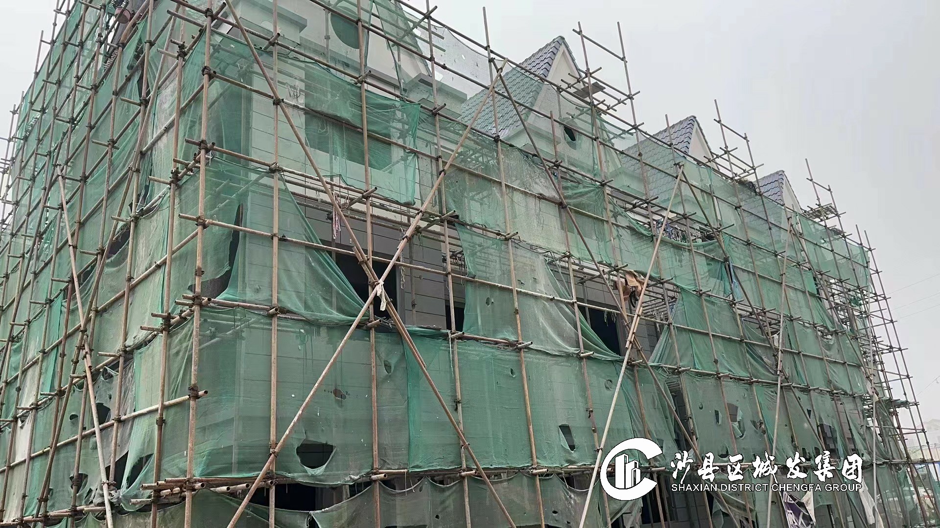 完成屋面防水卷材施工,挂网粉刷完成85%。