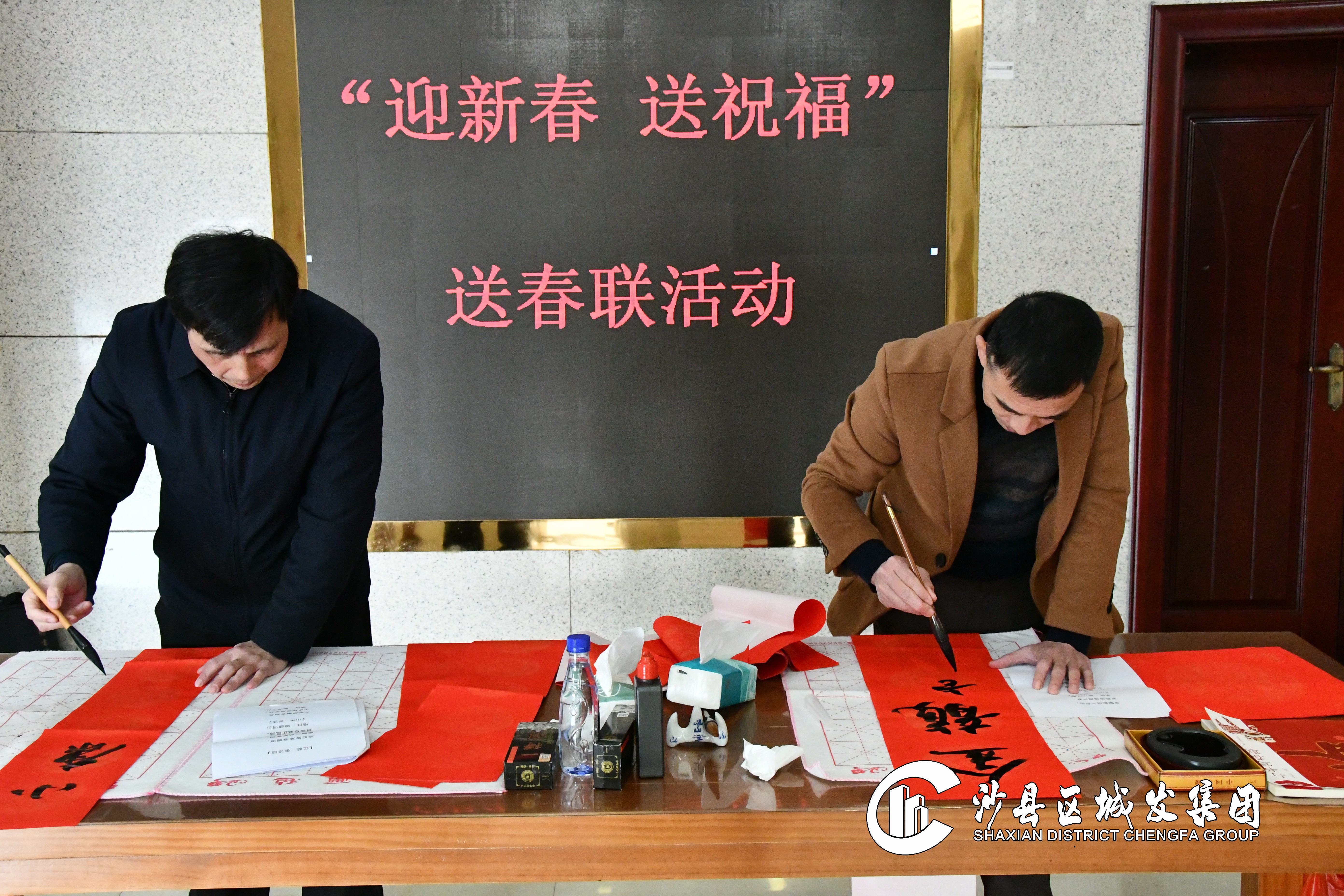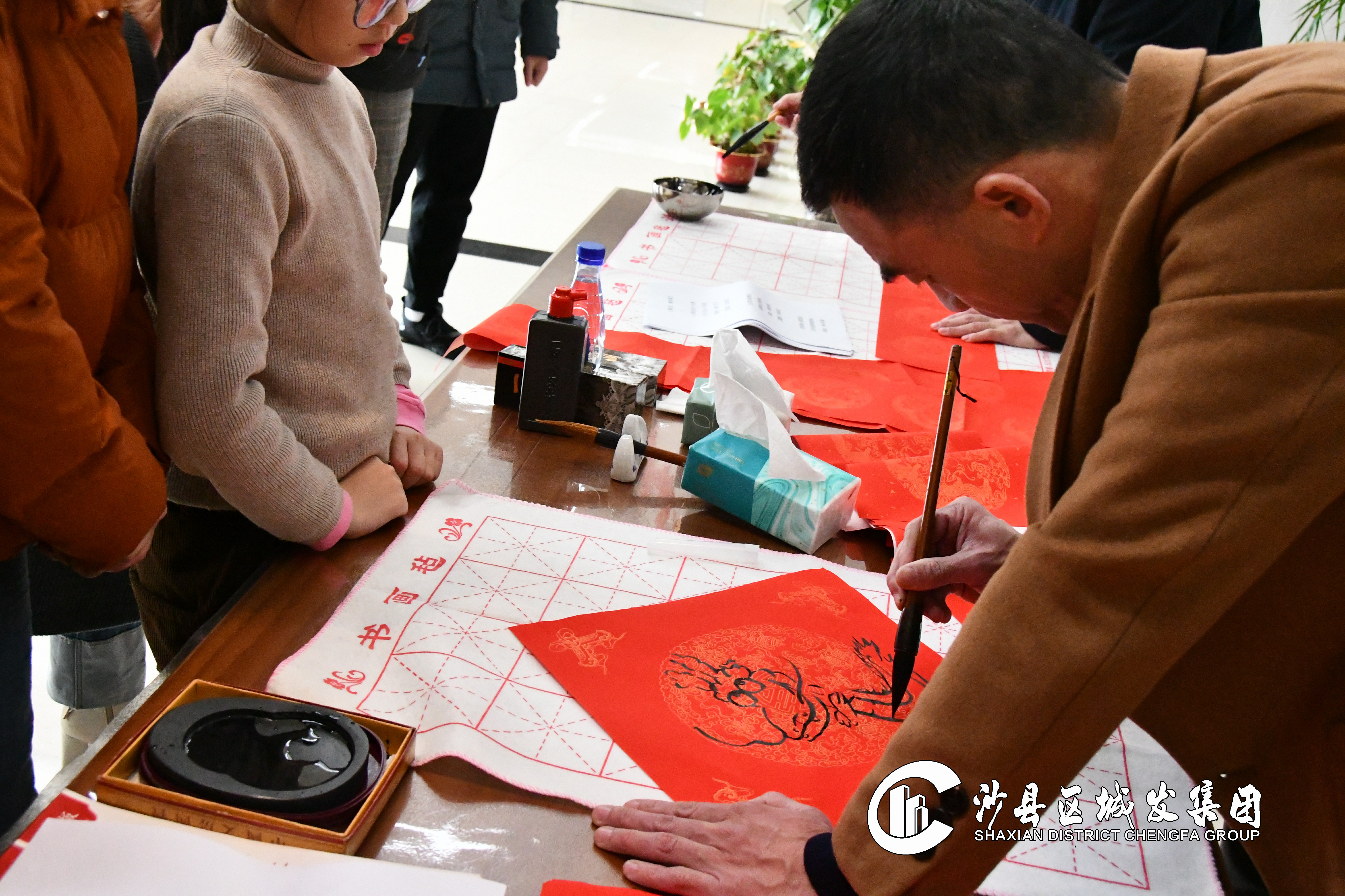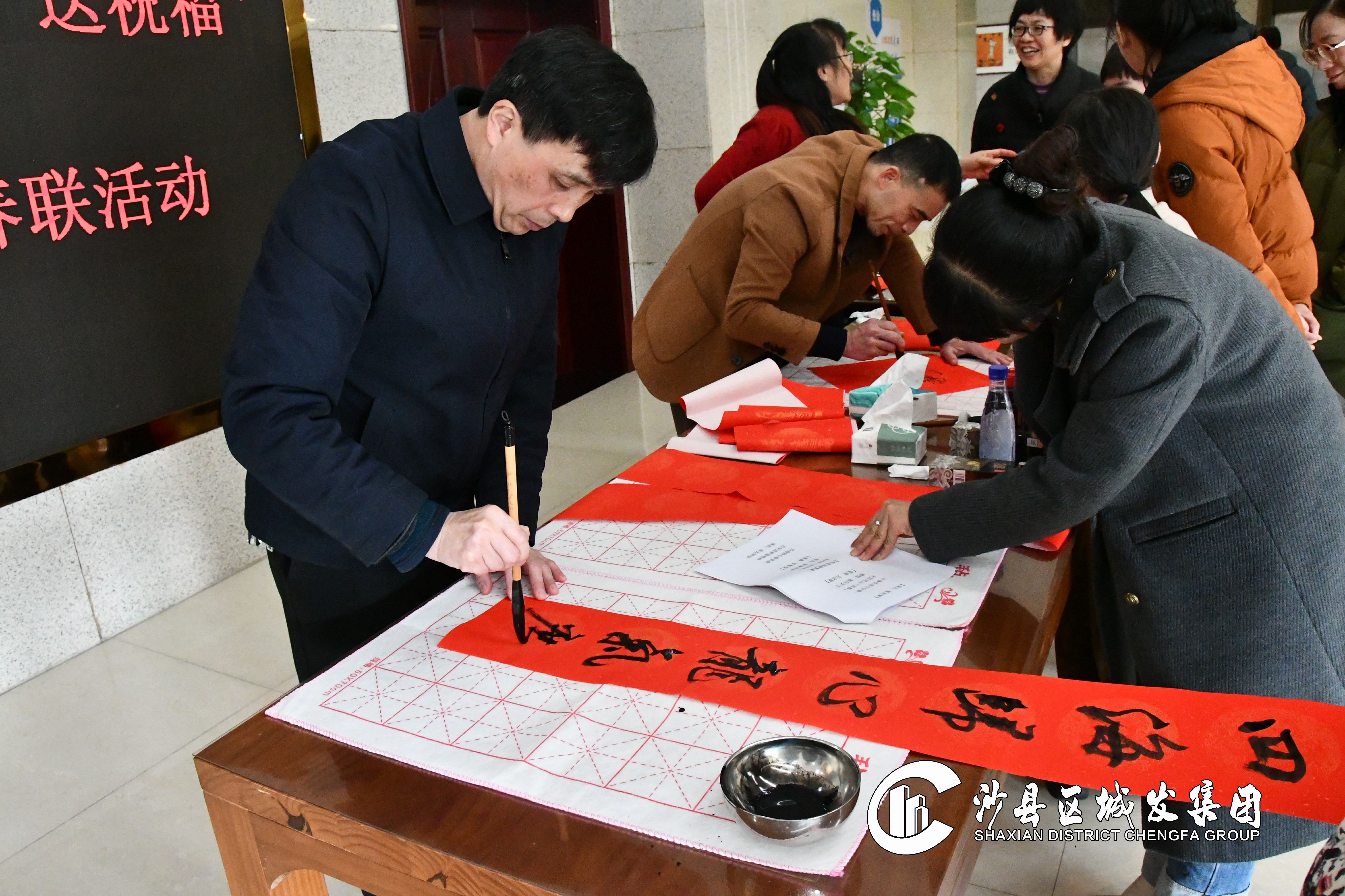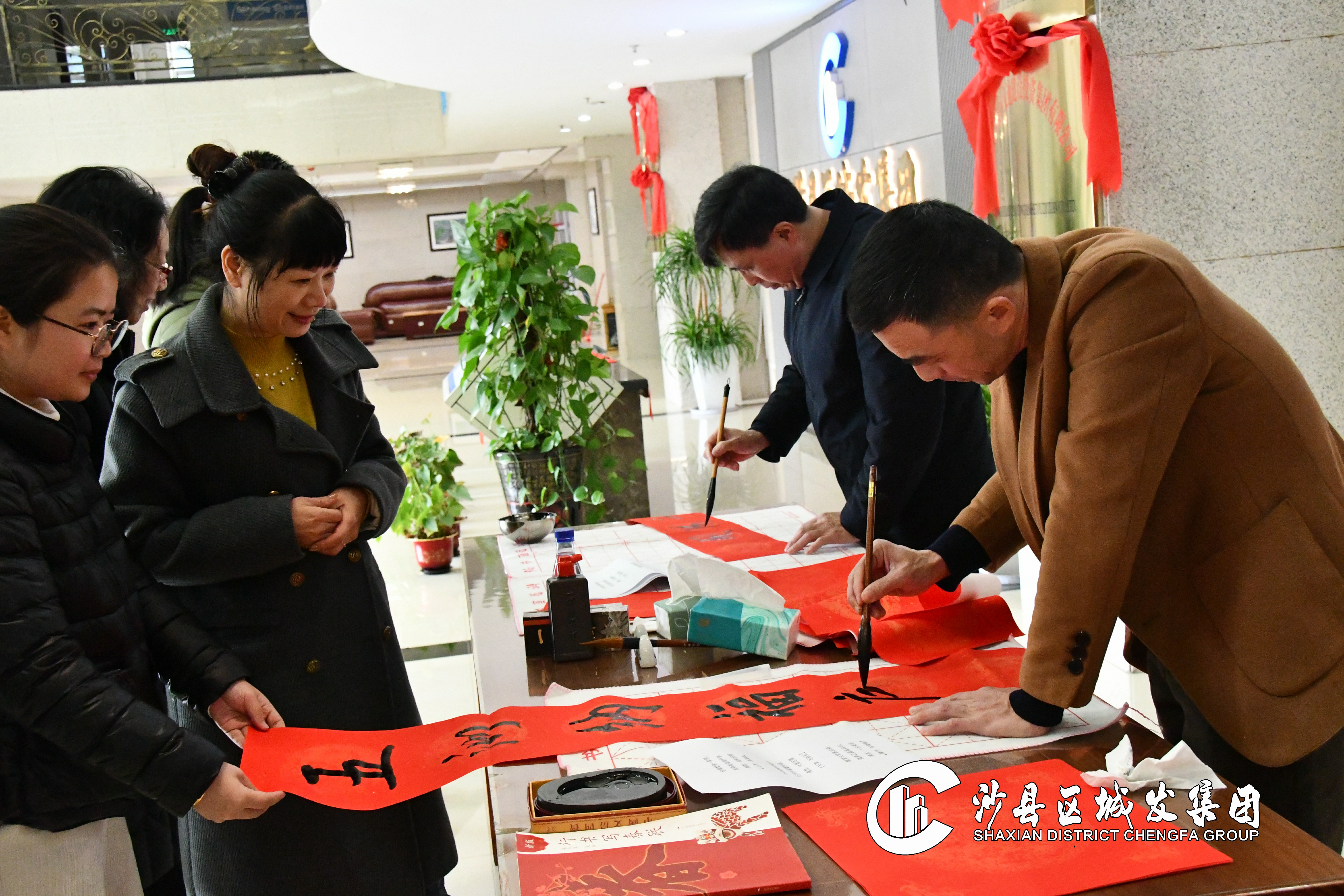 活动现场,福建省书法家协会会员、沙县书法家协会副主席、边景昭书画院院委陈志强和集团副总经理王永水认真专注,挥毫泼墨,撰春联、写“福”字、绘龙腾,引得围观的员工阵阵夸赞。大家认真挑选心仪的春联内容,耐心等待“私人订制”成品,或是围观欣赏,或是忙着摊晾春联,现场气氛热烈、喜气洋洋。
