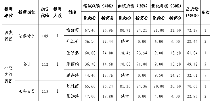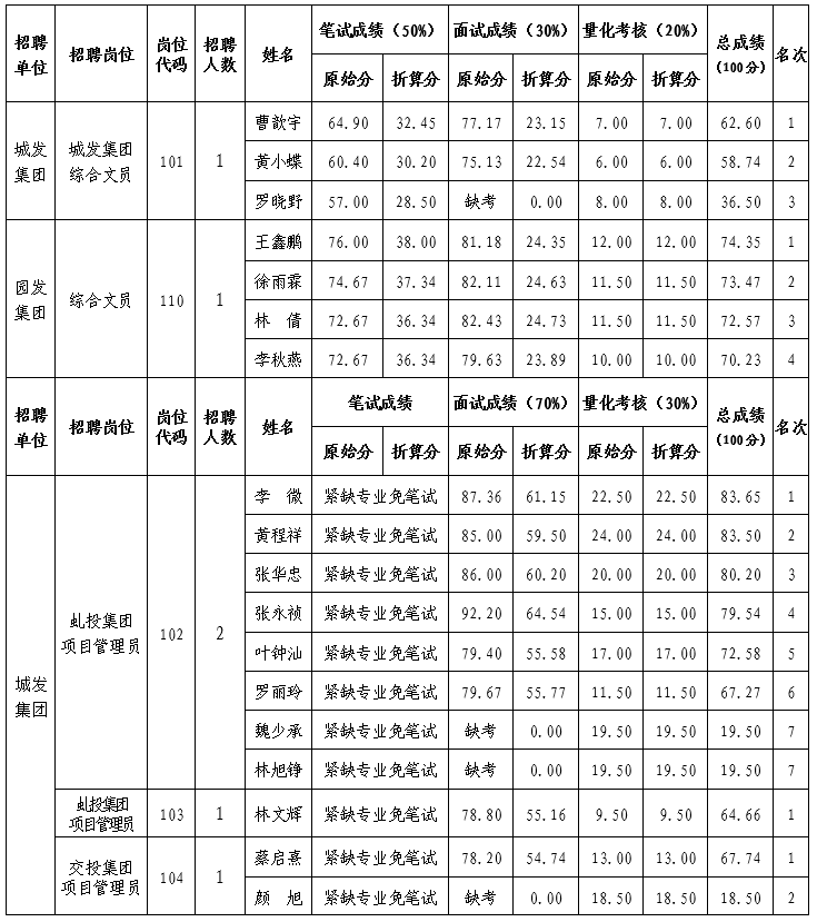根据《沙县区区属国有企业关于2022年下半年公开招聘工作人员公告》,现将本次招聘总成绩情况公告如下: